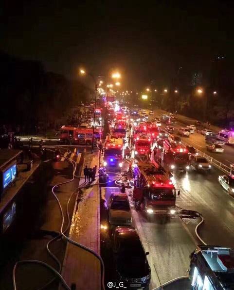 圖為數(shù)十輛消防車趕來救援。