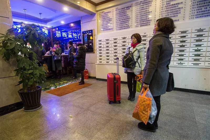 .東門大廈這邊有兩個酒店:東門賓館和布丁酒店。晚上8點多,住客都被叫起來。“賓館把我們趕下來了,說火勢太大,怕蔓延過來?!辈级【频暌粋€年輕女孩蹲在大門旁邊,呆呆地看著來來往往的行人。她實在無聊,便抽起了煙。圖為緊鄰火場的一家賓館,住客紛紛退房離開。
